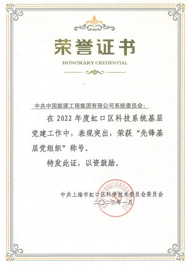 會議的最后,對虹口區(qū)科技系統(tǒng)基層黨建工作中表現(xiàn)突出的黨組織進(jìn)行了表彰,中國能源工程集團(tuán)有限公司系統(tǒng)黨委榮獲2022年度“先鋒基層黨組織”榮譽(yù)稱號。